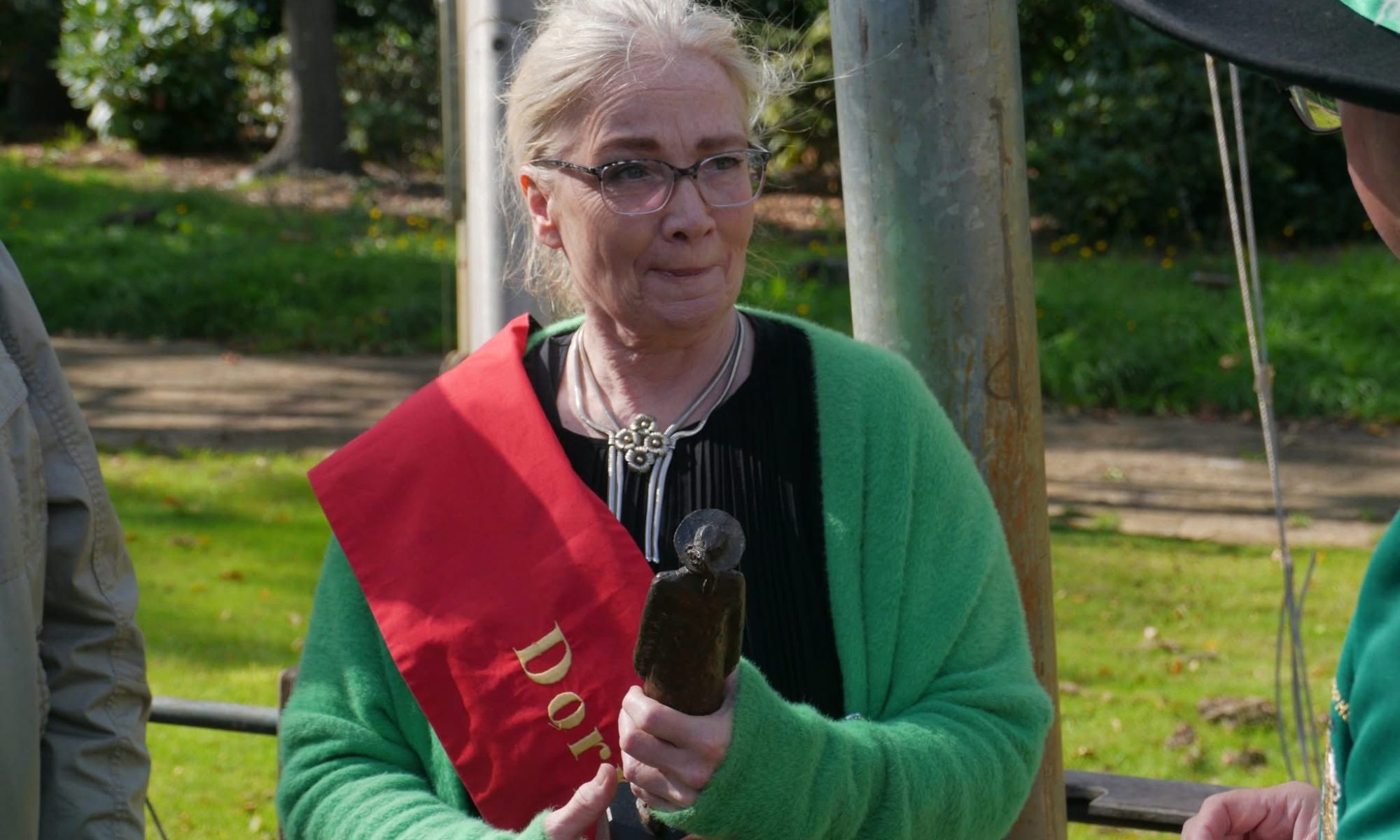 Gedurende de gehele dag was Leo wederom de stem van de dag om het tijdsschema te waarborgen en iedereen attent te maken van wat ging komen. Ruim een kwart eeuw lang was hij dé stem die de gilden aankondigde tijdens de optochten. Met zijn kenmerkende stemgeluid, enthousiasme en betrokkenheid gaf hij kleur aan iedere intocht. Vanuit het Kringbestuur waren er mooie woorden en kring-secretaris Nina van de Heuvel had de eer om Leo toe te spreken. Omdat Nina zelf ook als bruidsmeisje en tamboer actief was geweest had ze een persoonlijk band met Leo. Na afloop was er zelfs nog een persoonlijke boodschap alleen voor Leo. Maar nu, op een volle eretribune, direct na de massale opmars was daar de 1e huldiging van de dag. Nina sprak mooie woorden over Leo. “Jouw bijdrage ging veel verder dan alleen de aankondigingen. Je bent een vertrouwd gezicht, een vaste waarde binnen onze kring en een belangrijk onderdeel van de beleving op deze gildedagen. Wij zijn je ontzettend dankbaar voor jouw jarenlange inzet, toewijding en de fijne samenwerking. Daarom willen we jou danken voor alles en dat doen wij door het Kringkruis van Verdienste aan te bieden. We hopen je ook in de toekomst nog vaak te mogen begroeten. “ Onder toeziend oog van zijn vrouw Corry en in bijzijn van de kinderen Ellen & Hans en Teun & Saskia en hun kleinkinderen werd het wel erg officieel en mooi. We kunnen bijna zeggen koninklijk, want op de volle eretribune zaten diverse afgevaardigde en op een vol hoofdveld stonden ook veel prominenten. Leo werd groots in het zonnetje gezet. Het applaus, normaal ook door de tamboers met tromgeroffel ondersteund, hield nu minutenlang aan. En terecht. Leo van harte gefeliciteerd met het ontvangen van het Kringkruis van Verdienste! Maar hier bleef het niet bij. Rond de klok van 18.00 uur was er een klein officieel gebeuren in de feesttent en werden de feestende gildebroeders en gildezusters even tot rusten bedaard. Hoofdman Ron Beerens had na de uitslag van de optocht namens het Gilde St. Monulphus & Gondulphus nog een 2e verrassing in petto. Ook namens Ron waren er mooie en rake woorden voor Leo zijn bewezen diensten. Maar om deze woorden extra onderstrepen werden de vendeliers opgetrommeld om medewerking te verlenen. En waardering was er, want de vele gildebroeders en gildezusters in de tent gaven hier gehoor aan. Een traditie (wellicht zelfs in 2010 in Knegsel ooit ontstaan) was dat tijdens het lied Brabant van Guus Meeuwis de (hang) tafels in de tent bezet worden met vendeliers inclusief vaandel. Dit keer zou een groots eerbetoon worden voor Leo. Kippenvel! Massaal gingen de vendels de lucht in en stond Leo voor een 2e keer enorm te stralen op het podium. Corry stond ook te glunderen van een afstandje en was het een geslaagde actie. Na afloop van het liedje was het Leo die toch nog het laatste woord wilde. Hij bedankte iedereen voor de afgelopen jaren, voor het vertrouwen en de mooie periode. Vele bekenden van toen zijn nog steeds actief en aanwezig en dat gaf extra lading aan het moment. Leo en Corry waren erg ontroerd, zeker toen er spontaan nog een rij van tig gildeleden persoonlijk het duo nog een hand kwam geven als blijk van waardig. Leo, alleen de hele grote krijgen dit voor elkaar! Als Knegsels Gilde hebben we Leo vaak moeten missen in de optochten, maar voortaan zal Leo weer deel uitmaken van de groep. Samen zullen we nog vele gildedagen gaan bijwonen. Namens het Kwartier van Oirschot en het gilde St. Monulphus & Gondulphus willen we Leo hartelijk danken voor deze mooie periode!